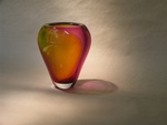 2011Mondgeblazen vaas, zeer transparant, in Fuchsia en Gelb. UItdijende schouders.